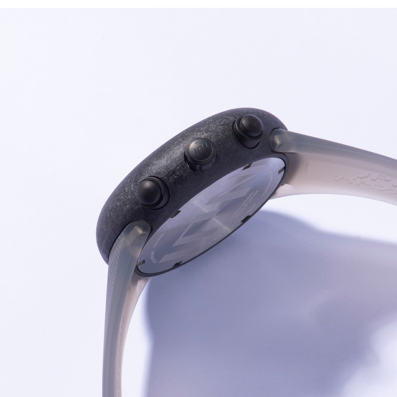 “130R Q1”の文字盤はフォージドカーボンダイヤル。クロノグラフ秒針にはレッド、ブルー、オレンジを採用し、よりビビッドな印象になりました。トランスルーセントストラップをセットし、総重量52gというワンランク上の軽さをお楽しみいただけます。さらにバーインデックスと時分針に施したスーパールミノバを従来の3倍厚にすることにより、発光量が一層大きくなるとともに発光時間もより長くなり、暗闇での視認性を大幅にアップさせました。