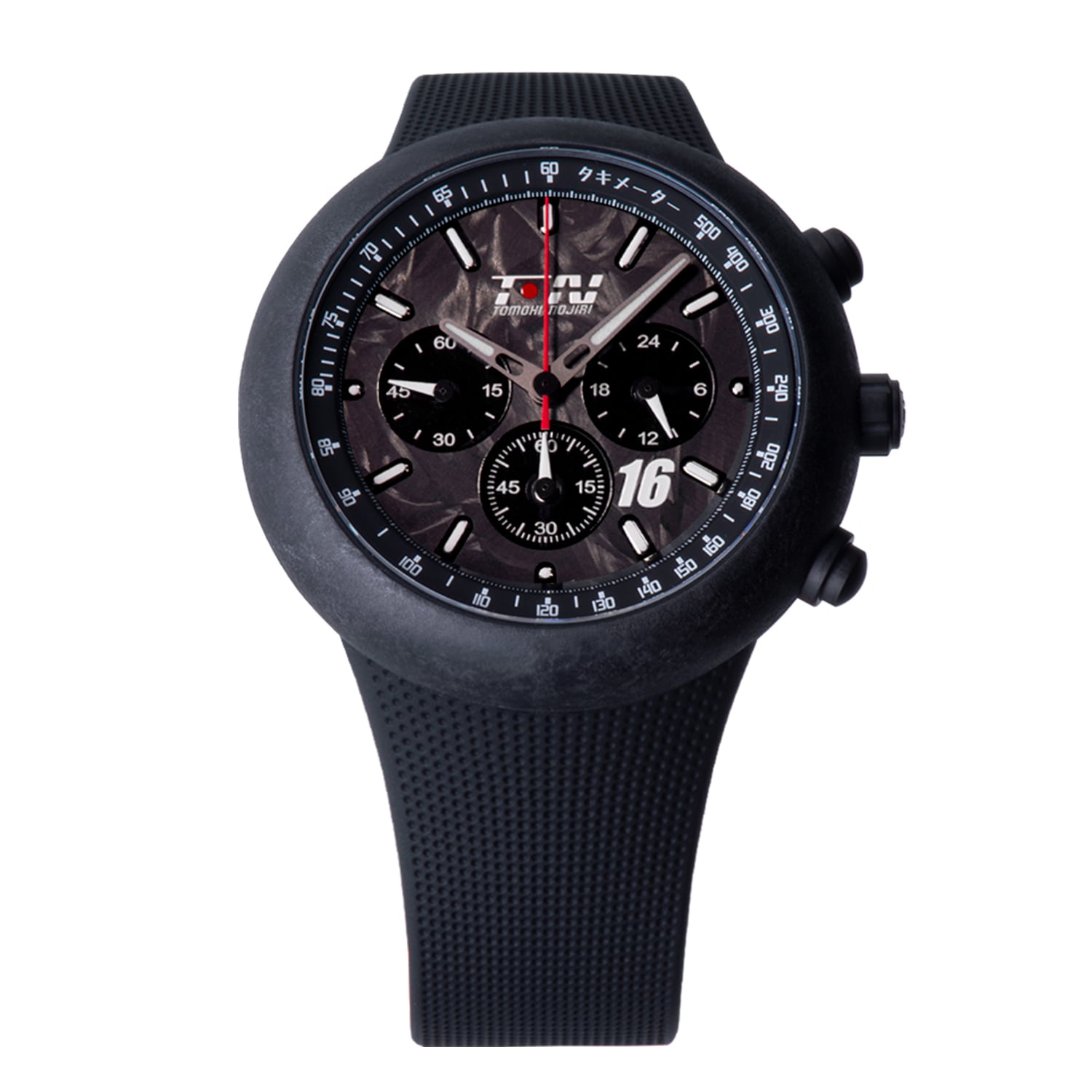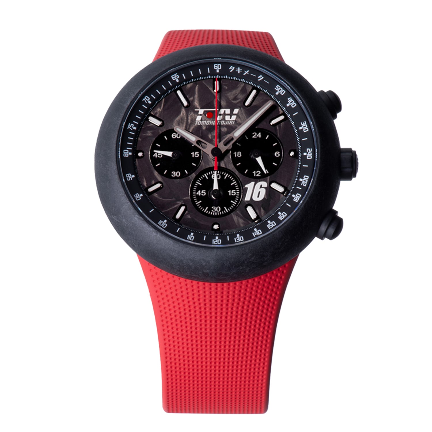 “130R TN”はスーパーフォーミュラで野尻智紀選手がドライブする16号車をイメージしています。1層目にポリカーボネート、2層目にフォージドカーボンをセットした2レイヤー文字盤には、12時位置に野尻智紀選手のロゴ、4時半位置にゼッケン番号があしらわれています。センタークロノグラフ1/5秒針にはマシンカラーをイメージしたレッドを取り入れ、クロノグラフ1/5秒針と同色のFKMラバーストラップを組み合わせました。アプライドバーインデックスと時分針に施したスーパールミノバは”130R Q1”と同様3倍厚で、既存コレクションと比較して発光量が一層大きくなるとともに発光時間もより長くなり、暗闇での視認性が大幅に向上しています。