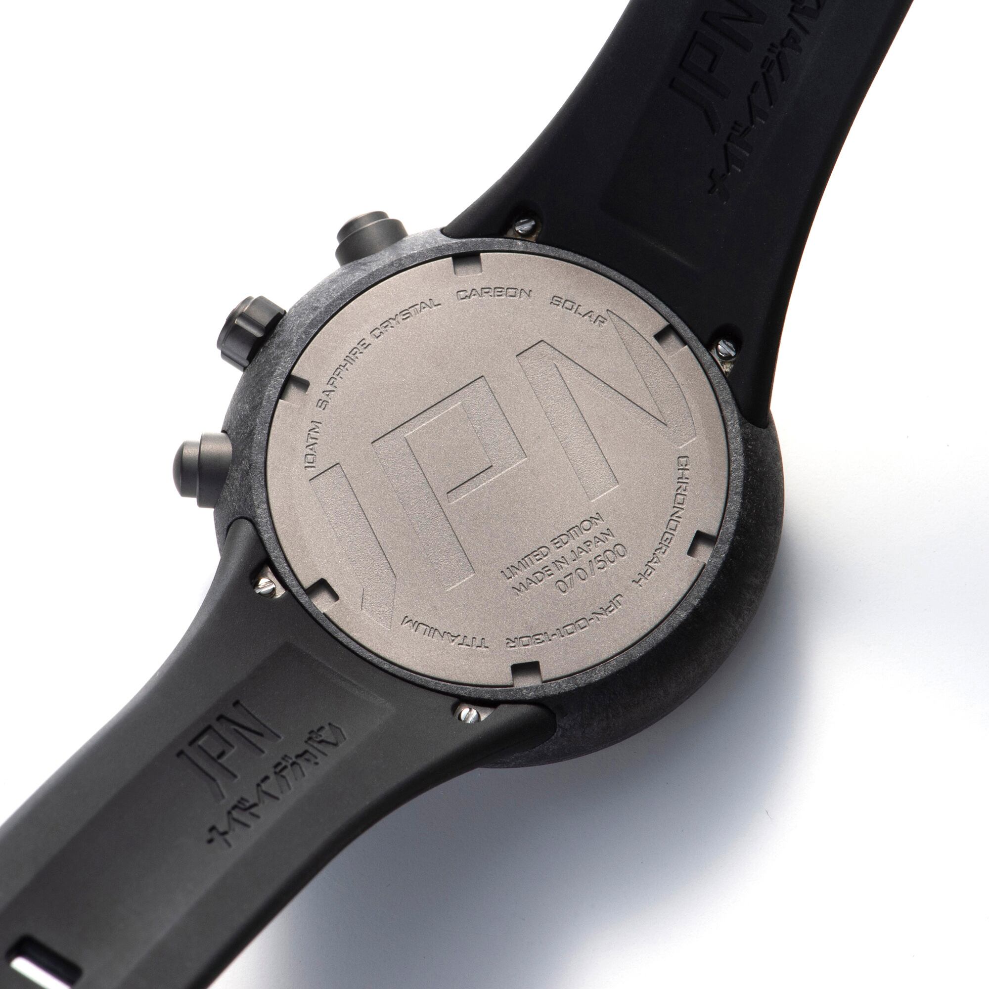 The exterior materials used for the JPN are carbon, titanium and polycarbonate, the same materials actually used in the best racing cars. The heart of the watch is a solar-powered quartz movement, which is highly accurate, requires no regular battery replacement and is environmentally friendly.